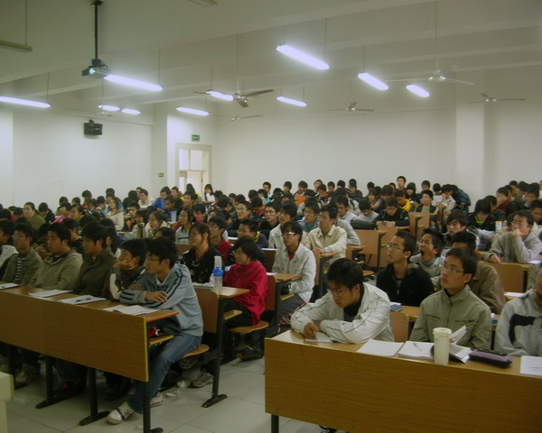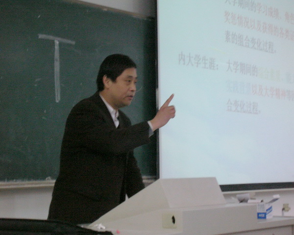 讲座开始了,教室里座无虚席,彭书记精彩的讲话不时赢来阵阵掌声。他通过freshman最疑惑的两个问题“什么是大学”和“大学需要什么样的人才”把同学们带入思考,并由此引入讲座的主题——老员工职业生涯规划。围绕此主题,彭书记陆续阐述了“外老员工涯”与“内老员工涯”的定义以及老员工涯开发与管理的具体内容。讲台下,同学们都听得认真仔细,时时记下对自己有用的东西。彭教授指出,同学们在对自己的老员工涯作规划时,一定要有目标,并制定出适合自己的短期、中期及长期目标,然而在制定好目标后,执行才是规划最重要的一步。最后他以 “成功永远属于那些善于总结,敢于正确面对困难和打击,勇于挑战自我并从不为失败找任何借口的人”勉励同学们认真对待自己的老员工涯,讲座在同学们热烈的掌声中圆满结束。