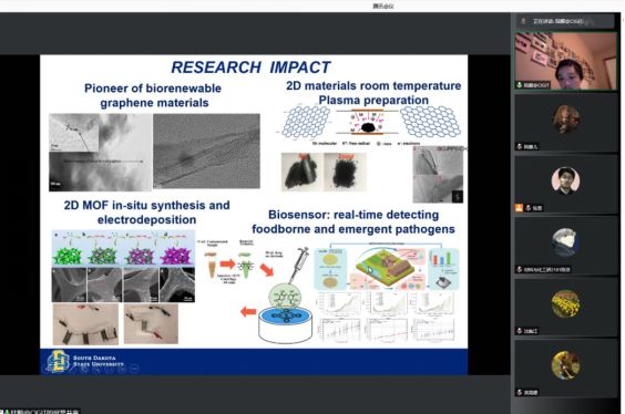 古教授首先介绍了自己的留美经历、研究方向、主持的科研项目和访学交流/招生情况。随后,古教授介绍了他在二维材料制备、导电MOF传感器和储能方面的近期研究进展。最后,古教授还和参会的师生进行了热烈的学术讨论。