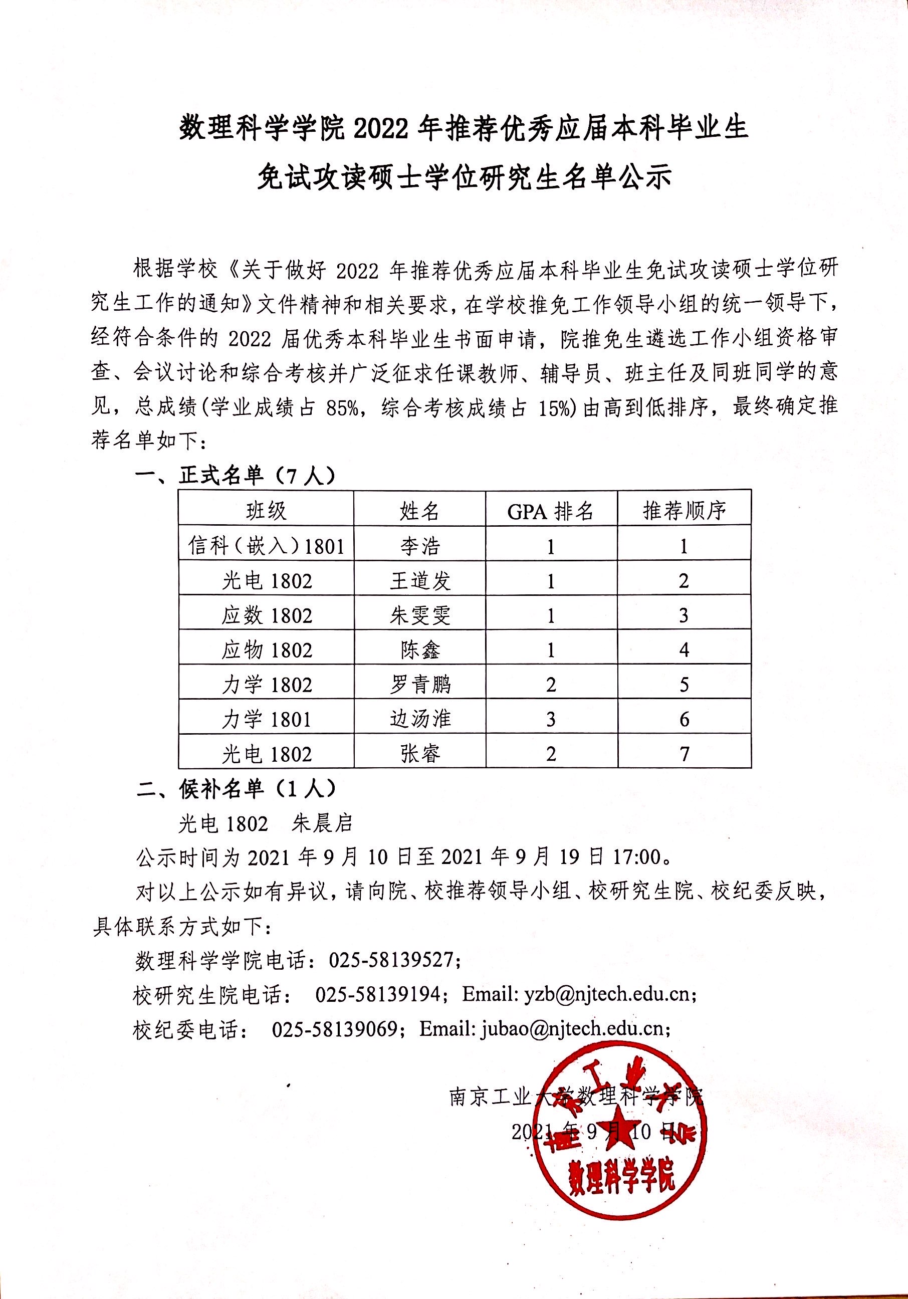 太阳集团tcy8722关于2022年推荐优秀应届本科毕业生免试攻读硕士学位研究生名单的公示