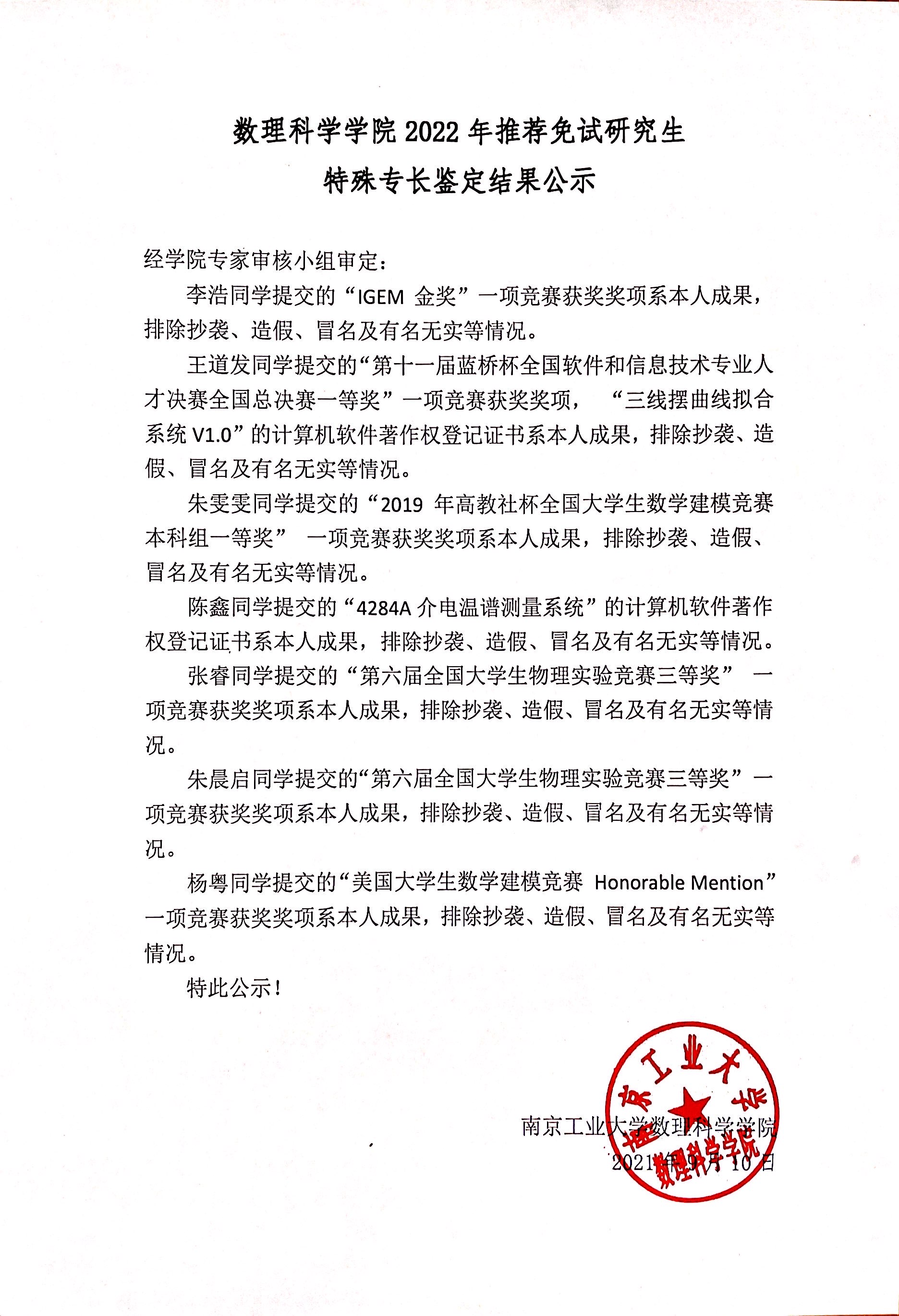 太阳集团tcy8722关于2022年推荐免试研究生特殊专长鉴定结果的公示