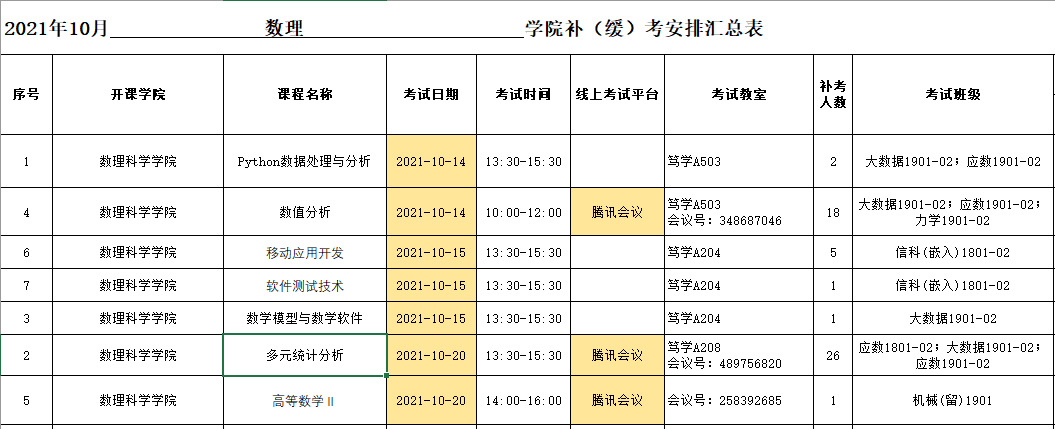 2021年10月补考数理公司数学系自排考试课程考试时间和地点通知