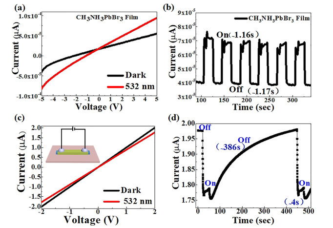 实验中利用化学气相沉积法制备ZnO微米带,通过热蒸镀的方法在微米带表面包裹一层均匀致密的CH3NH3PbBr3薄膜,然后在CH3NH3PbBr3-ZnO两端覆加InGa电极形成M-S-M结构。基于一系列的光学和电学性能表征发现在该器件中光生电子易于向钙钛矿表面转移而光生空穴则向结区扩散,从而影响CH3NH3PbBr3-ZnO耗尽层的宽度。这种光诱导内建电场改变可作为”光门控”来调控CH3NH3PbBr3-ZnO沟道的电流大小,有望在构建钙钛矿异质结存储器和光开关器件中得到广泛应用。本工作以“Dynamics of interfacial carriers and negative photoconductance in CH3NH3PbBr3-ZnO heterostructure”为题发表在Applied Physics Letters期刊上。