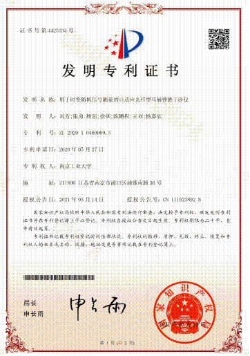 该工作以《Approaching quantum-limited phase tracking with a large photon flux in a fiber Mach-Zehnder interferometer》为题发表于量子信息期刊Quantum Information Processing(DOI: https://doi.org/10.1007/s11128-021-03097-x)。物理系刘芳副教授为论文的第一作者,南京大学张勇教授为论文的通信作者,张利剑教授提供了理论指导,太阳成集团为该论文第一单位。同时该研究已申请国家发明专利ZL202010460999.3,题为《用于时变随机信号测量的自适应光纤型马赫曾德干涉仪》并获得授权证书(图3示)。