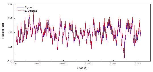图2. 时变随机相位估计的时域图。红线为待估计的随机信号,蓝线为卡尔曼滤波器给出的最佳相位估计值。
