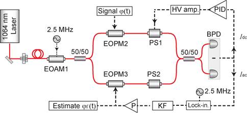 基于此,公司刘芳老师课题组提出一种自适应光纤型马赫曾德干涉仪系统,(如图1)。该光学干涉系统可用于随机相位估计(如图2),光纤干涉仪两臂分别加载了信号传感单元和信号反馈单元。在激光干涉相位测量的线型高斯系统中,采用了卡尔曼滤波器构建随机相位估计环路,给出最小测量方差下的最优相位估计值。系统采用PID器件构建一个低频低增益慢环,用于抵消振动、温度等环境扰动引入的相位漂移。装置采用电光调制转移技术,对光纤干涉仪的光学输入态进行幅度调制,探测信号再解调至低频段,实现了接近标准散粒噪声受限的低频相位测量。相比于现有技术,该方法可大幅度提高干涉仪输入端的注入光子数至3.7×1010 s-1,将随机相位估计的最小方差降低至。同时该光纤系统体积小可搬运且集成度高,在航天航海探测工程中有更有应用潜力。
