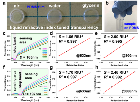 Fig.1 (a) Liquid RI enabled continuous transparency adjustment of the prepared PC dots. (b) PC sample on PDMS film attached to the inner wall of cuvette for spectra measurement. Dependence of transmission spectra on RI of potassium chloride water solution with sphere diameter of (c) 165 nm and (f) 197 nm. Dependence of transmittance at wavelength of 633 nm on RI with sphere diameter of (d) 165 nm and (g) 197 nm. Dependence of transmittance at wavelength of 800 nm on RI with sphere diameter of (e) 165 nm and (h) 197 nm. D, S, and RIU represent for diameter, sensitivity and refractive index unit, respectively.