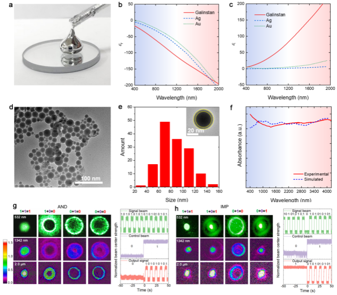 论文以“All-in-one, all-optical logic gates using liquid metal plasmon nonlinearity”为题发表于《Nature Communications》(IF:16.6),公司王雨淋副教授为论文共同第一作者,主要负责理论计算工作;南京大学谢臻达教授、胡小鹏教授、周林教授为论文共同通讯作者。论文链接:https://www.nature.com/articles/s41467-024-46014-3。