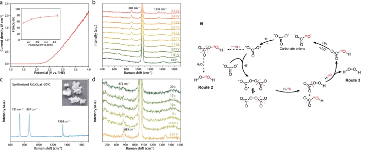 图1.碳酸钾溶液中Pt电极电化学WOR产H2O2的法拉第效率、原位电化学拉曼光谱及可能的反应路径。