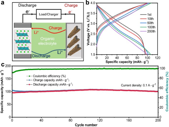 在本项工作中,我们采用在有序介孔碳(CMK-3)表面原位生长均匀的FVO纳米粒子,形成了一个具有高电导性的多孔网络FVO/CMK-3,其原理图如图1所示。CMK-3的结构有助于防止FVO颗粒的聚集,且其良好的电导性能能够进一步提高FVO/CMK-3的电导率,并在循环过程中缓冲FVO颗粒的体积膨胀。因此,FVO/CMK-3在10 A/g电流密度下,经过2500次循环仍能保持364.6 mAh/g的优异快速充电性能,并且每次循环的平均容量损失仅为0.003%。此外,以LiCoO2为正极和FVO/CMK-3为负极构建的全电池在200次循环后仍能保持100.2 mAh/g的高容量和96.2%的高容量保持率,其电化学性能能如图2所示。其卓越的电化学性能表明,FVO/CMK-3是具有高能量密度、稳定性和快速充电能力的锂离子电池理想负极材料候选者。