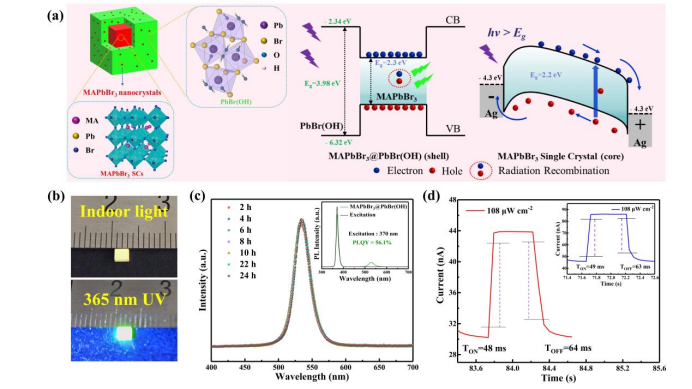 阅读次数: 发布时间:2025-04-07有机金属卤化物钙钛矿(MAPbX3)具有高吸收系数、强光捕获能力、较低激子结合能和光致发光量子产率等光电特性,将其应用范围从光伏扩展到发光二极管、光电晶体管、传感器和柔性器件等领域。特别是钙钛矿单晶,由于没有晶界,载流子迁移率高,发光率高,探测效率高,可以实现所有载流子在钙钛矿层上的寿命和扩散长度的上限,使其成为研究其固有物理性质和设计高性能全光、高能辐射探测器和激光器的理想材料。然而,钙钛矿材料容易受到几乎所有环境因素的影响,如热、潮湿、气体暴露和光照射。近来发现卤化铅氢氧化物PbBr(OH)可以作为钙钛矿的保护基质,使其免受外界环境的影响。此外,PbBr(OH)及其对应的卤化物钙钛矿呈现I型核壳结构,使得电子和空穴被限制在钙钛矿核内,从而提高了钙钛矿的辐射复合速率和光致发光量子产率(PLQY)。