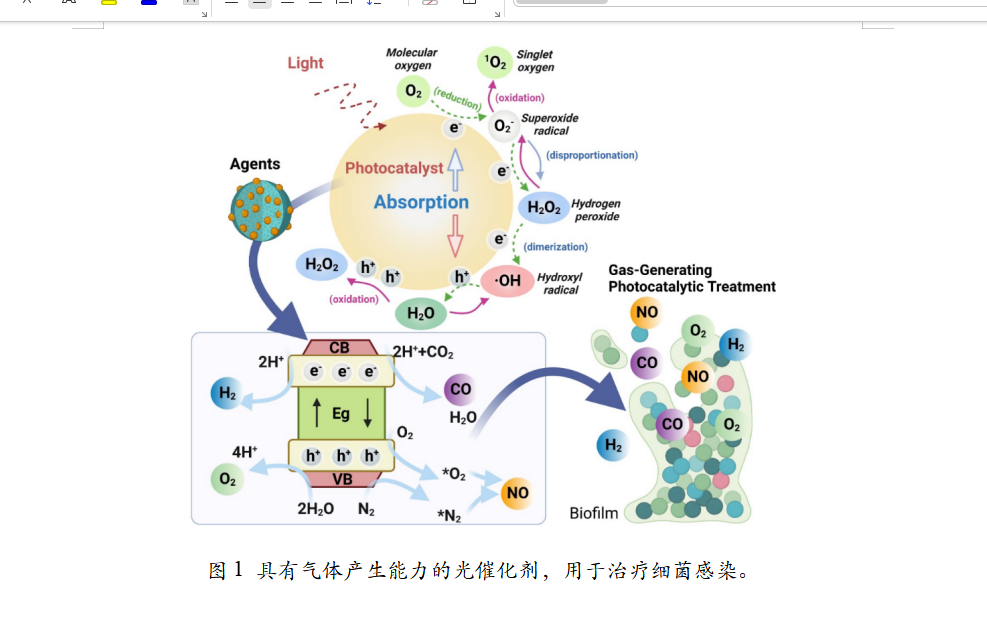 以光为动力源激活光催化剂,产生治疗性气体和活性氧(ROS)这一特点,将光催化抗菌与气体疗法相结合,可精确控制气体分子的产生,并显示出协同或增强的抗菌功效,为细菌感染治疗提供了新的途径(图 1)。具体包括如下气体: