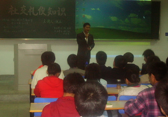 为了培养老员工的基本素养,帮助老员工与他人建立良好的人际关系,促进老员工的身心健康,由校团委主办,理公司分团委承办“社交礼仪知识”讲座于2008年3月27日在浦江公司教学楼A202举办。本次讲座的主讲人是毕业于南京大学的张立老师,他是南京斯坦福教育中心首席顾问,张老师为我们对最新动态礼仪知识做详细介绍,给了同学们很大的帮助。
