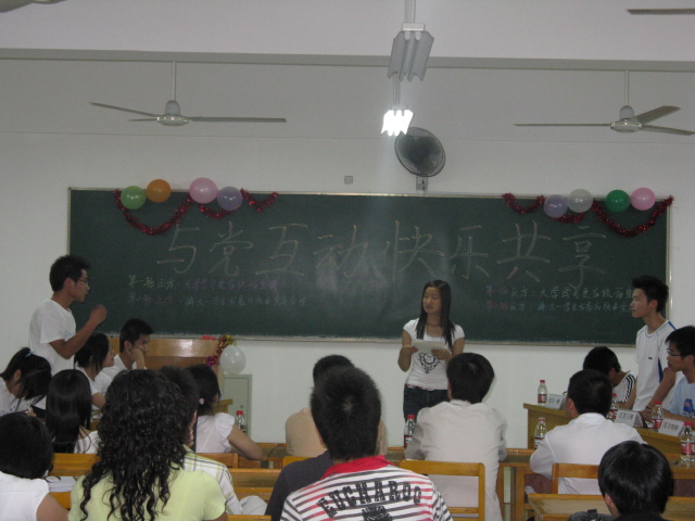 阅读次数: 发布时间:2008-07-072008年5月30日晚上6:30在同和515理公司员工第二党支部进行了党日 “党,就在我身边”系列党日活动的最后一场活动。参加这次活动的有理公司分团委副书记魏文斌老师、崔锐博老师,第六届“启航杯”辩论赛最佳辩手,应化0501班陶涛同学,理公司员工第二党支部宣传委员轻化0401班袁寅瑕同学,理公司员工第二党支部全体党员以及各辩论队的亲友团。