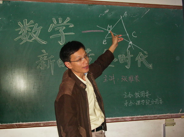 本次讲座的主讲人是,理公司数学与应用数学系副教授张维荣老师。张老师由数学的源头,古希腊数学、中国古代数学讲起,对数学各个时代的发展作了详细而又系统的介绍。他提到:Newton时代的数学是数学发展的一个转折点,它极大地推动了数学的发展;近代数学则让数学有了更深层地的发展有了很大的提高。教室内座无虚席,同学们听得津津有味,不时发出阵阵感慨。张教授对最近50年来的数学发展做了更进一步的讲解,数学近50年的发展是空前的,可以说是一个黄金时代。数学与数学应用在更高层次上结合,特别是在高新技术领域方面的进展层出不穷,屡屡出人意料。如今,数学已经深入应用与科学、技术、经济、管理等众多领域,它对社会发展有巨大的推动作用。现代数学在古希腊数学、中国古代数学、近代数学的基础上有了更进一步的提高,它与我们的生活息息相关。