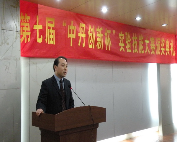 校员工工作处处长吴胜红宣读了表彰决定。与会领导和嘉宾给荣获一、二、三等奖、创新奖以及综合奖的获奖选手和单位代表颁奖。接着,化学组创新奖获得者生工0501班张曙澎同学代表全体获奖选手发言。