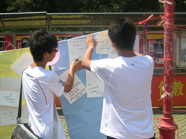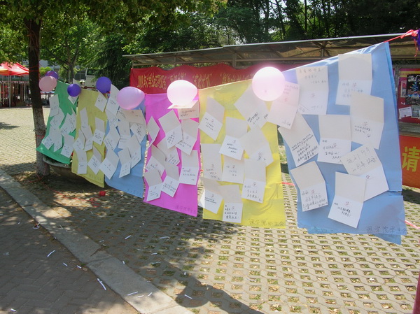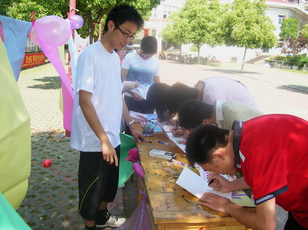 上午8:30,母亲节征文及贺卡征集活动在东苑餐厅前广场准时开始。同学们纷纷在纸片、卡片上写下了自己对母亲的祝福。
