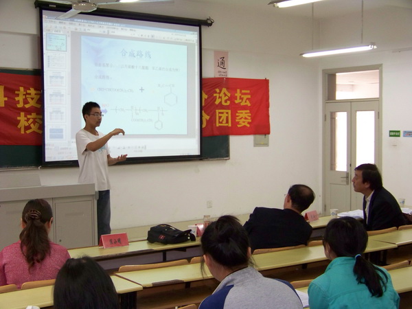 上午9点,论坛准时开始。各位参赛选手依次走上讲台,利用自己精心制作的PPT进行自述。其参赛课题内容广泛,涵盖了如有机化学、分析化学、配位化学、物理化学在内的各个研究方向。每一位自述的同学都是经过充分的准备、详细地阐述了各自研究的课题和方向。