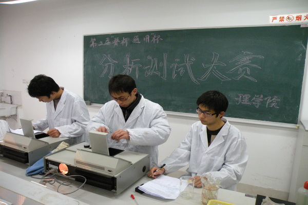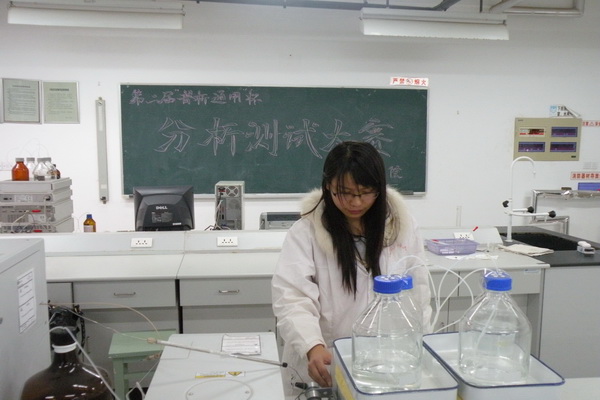 上午8点30分,陈国松教授向参赛选手讲解了比赛的注意事项及实验室操作规范,随后选手们就在实验室开始了紧张的实验。比赛期间,评审组的专家们观察每位同学的实验操作技能,并就相关的操作步骤提出问题。同学们根据自己制定的实验方案,利用普析通用公司的722型分光仪等仪器和化学实验教学中心提供的设备和药品展开实验。在长达8小时的比赛过程中,他们规范操作、用心观察、仔细记录、严谨分析,克服了重重困难,在比赛规定时间内完成了实验并提交了实验报告。最终,经大赛评审委员会评定,耿燕、王玲等26名同学分别获得一、二、三等和创新奖。