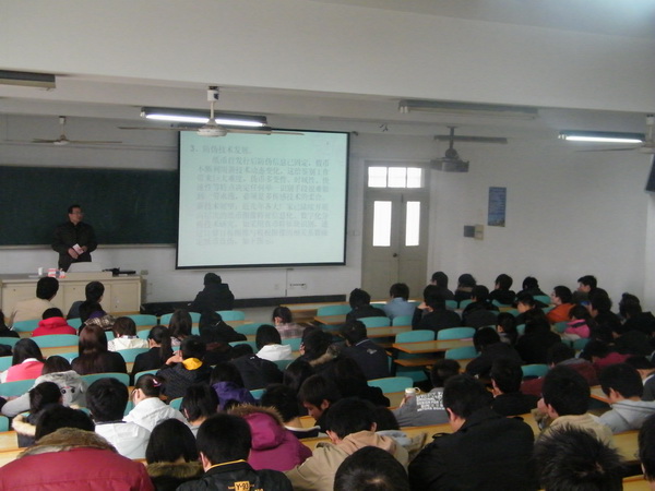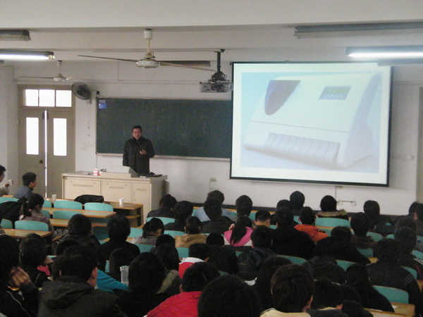 首先,杨总介绍了江苏金陵工电有限公司的情况,以及纸币识别算法的研究现状和热点,还结合自己目前的工作,详细介绍了纸币识别技术方面的工作。杨总从讲述辨别纸币真伪的方法入手,向同学们介绍了防伪技术的发展过程,使同学们对纸币以及防伪技术有了新的认识。接着他简单介绍了世界各国的点钞机和清点机,并简述其操作原理。最后,杨总详细地阐述了算法在纸币识别技术中的运用原理,强调了算法的重要地位。短短两个小时中,杨总的讲解深入浅出,富于启发性。与会的同学们认真听讲,不时报以热烈的掌声。