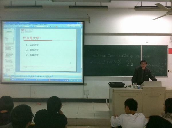 施庆生教授首先向新生们提出了三个问题:什么是大学?如何感知大学?如何在大学里实践?并就这三个问题阐述了自己的看法和对同学们的建议,帮助新生更好地认知和感受大学的学习和生活。接着,施老师还介绍了每个专业的培养方案、教学计划以及校教务处的办公程序,鼓励新生们认真学习专业知识,注重实践,将所学到的知识灵活应用到实际生活中,在科学研究中锻炼独立思考的能力,并建议新同学们尽快明确自己的大学目标并为之努力。接着,施老师又特别介绍了学分制的特点以及毕业、学士学位授予细则等规定,详细分析了大学四年不同时期的不同目标,鼓励同学们做好学业设计与规划。他还建议新生以宿舍为单位组成课程学习小组,强调了暑期社会实践的重要性,希望同学们多接触社会,有目的地设计自己的美好未来。