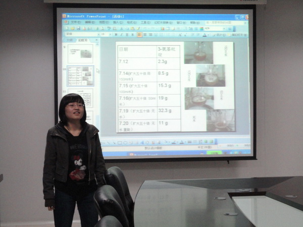 5分钟自述之后是答辩环节,各位评委老师针对同学们的实验进行提问,以检验他们对实验的认知和掌握程度。对于实验原料的选择、实验数据的一些瑕疵评委老师提出了一些要求。整个过程气氛热烈,俞斌教授甚至把参赛选手叫到自己身边进行悉心的教导,使同学们受益匪浅。评委老师们的精彩点评博得了在场的同学们的阵阵掌声,同学们从中明白要想在科研的道路上走得更远,必须具备更强的动手能力和更丰富的经验。