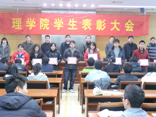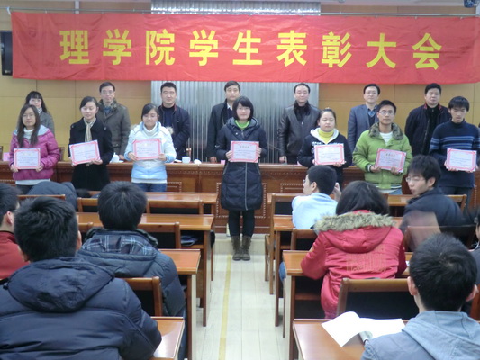 主席台领导为受表彰的集体和个人颁发了奖状。应数0801班吴海、信科0801班史菲菲、应数0801班田亚慧、信科0801班李晟泽分别发表先进班级、三好优干、优秀员工党员和创业创新奖获奖员工发言。他们从班级凝聚力、学习方法、责任心和学科竞赛等方面谈了自己的成长经历和心得,与大家共同分享经验和喜悦。