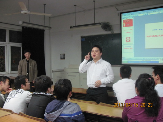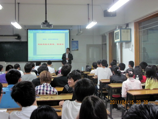 报告会由理公司信息与计算科学系主任邵建峰老师主持,在座的是信息与计算科学专业的在校同学们,报告会邀请到的员工分别是现任苏宁电器集团行政总部物业管理中心设备工程管理部经理赵杰,现任华为技术有限公司中国区无线行销产品经理倪茂树,南京大学计算机公司研究生即将赴英留学的付彦伟。