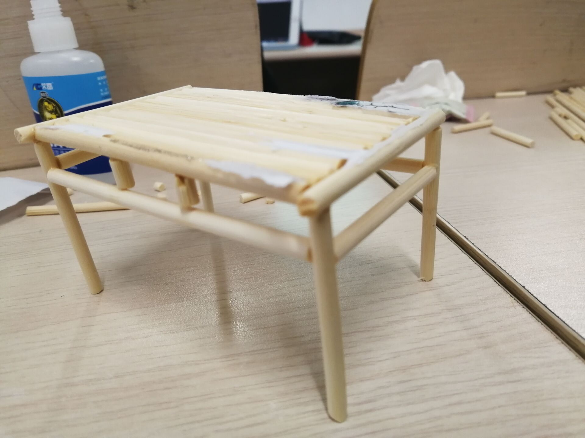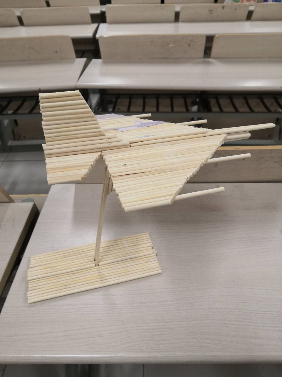 本次活动内容为筷子“DIY”,支部成员在规定的时间内在班级用大量筷子及胶水或橡皮筋等材料完成物体的制作,结构种类不限制,要求体现物体结构的合理性与造型的美观性相结合的创新思维。主要锻炼支部成员在物体结构设计方面的能力。活动开始后,首先由团支部书记黎兴燕宣读本次活动注意事项以及活动规则,然后支部成员领取筷子等工具,三人为一组。制作过程中每组成员各显神通,赞美和讨论不绝于耳,偶尔也有同学埋头苦思,想尽可能完美的完成自己的作品,这种纯真热烈的积极向上的情怀,正是新时代中国老员工所需要传承发扬的。经过一个多小时的时间,支部成员们的作品大多都完成了,有精致小巧的书桌,也有大气蓬勃的亭台楼阁,引来阵阵惊呼,令人刮目相看。最后大家捧着自己的作品上台合影,眼睛里满是喜悦和意犹未尽。