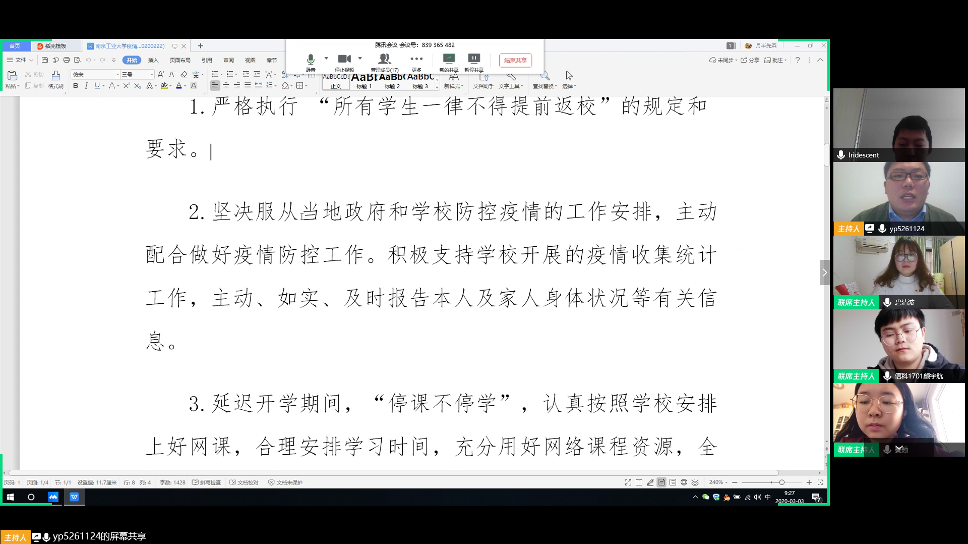 阅读次数: 发布时间:2020-03-03为进一步加强公司青年员工网上思政教育和组织管理,发挥基层团支部在疫情防控期间的战斗堡垒作用及团员青年的先锋模范作用,发扬“党有号召,团有行动”的优良传统,切实保障青年员工的身心健康,3月3日上午,根据校团委《湖北籍员工临时团支部线上主题团日活动建议方案》,经校团委批准,在公司党委的关心和指导下,太阳集团tcy8722湖北籍员工临时团支部正式成立。院团委书记毕清波老师、副书记岳鹏老师、团总支员工干部以及公司湖北籍员工共同参加了本次网络视频会议。