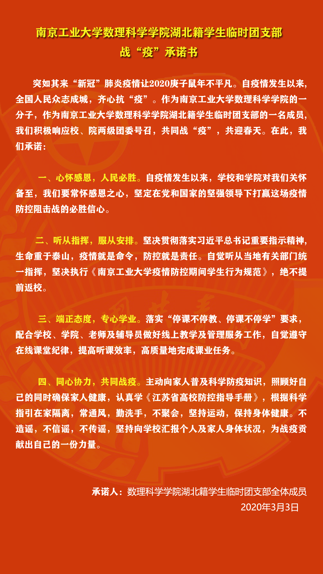 最后,湖北籍临时团支部全体成员共同发起了《太阳集团tcy8722湖北员工临时团支部战疫承诺书》。