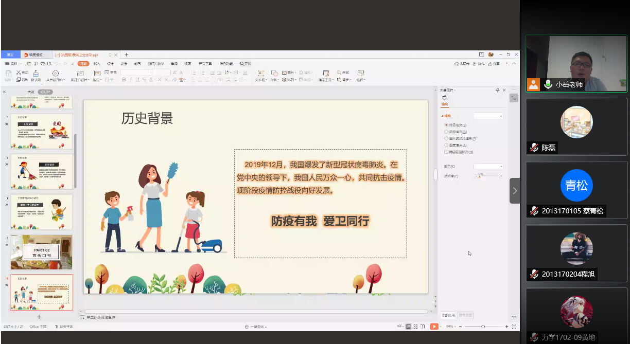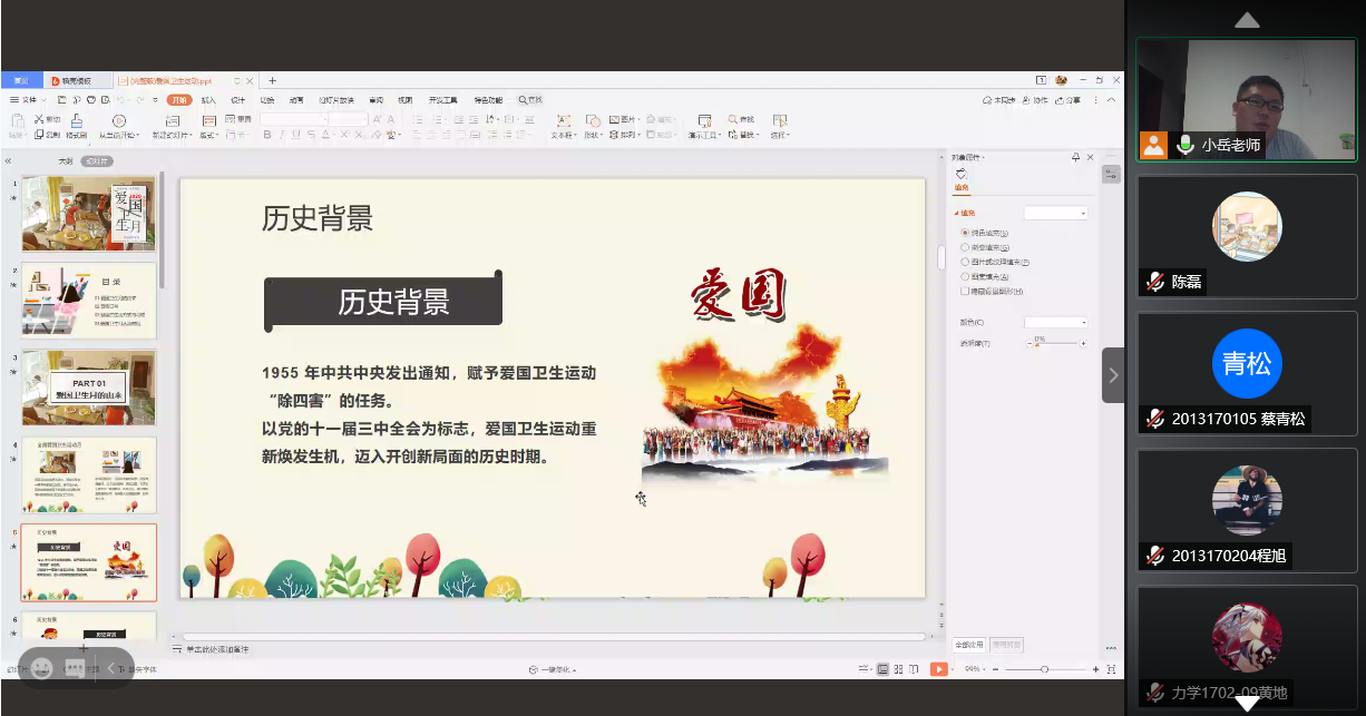 本次线上课堂共分为三个部分即爱国卫生月的由来及背景、健康的生活方式与习惯、如何践行。岳老师用诙谐幽默的语言结合真实案例给线上的同学们上了精彩一课。