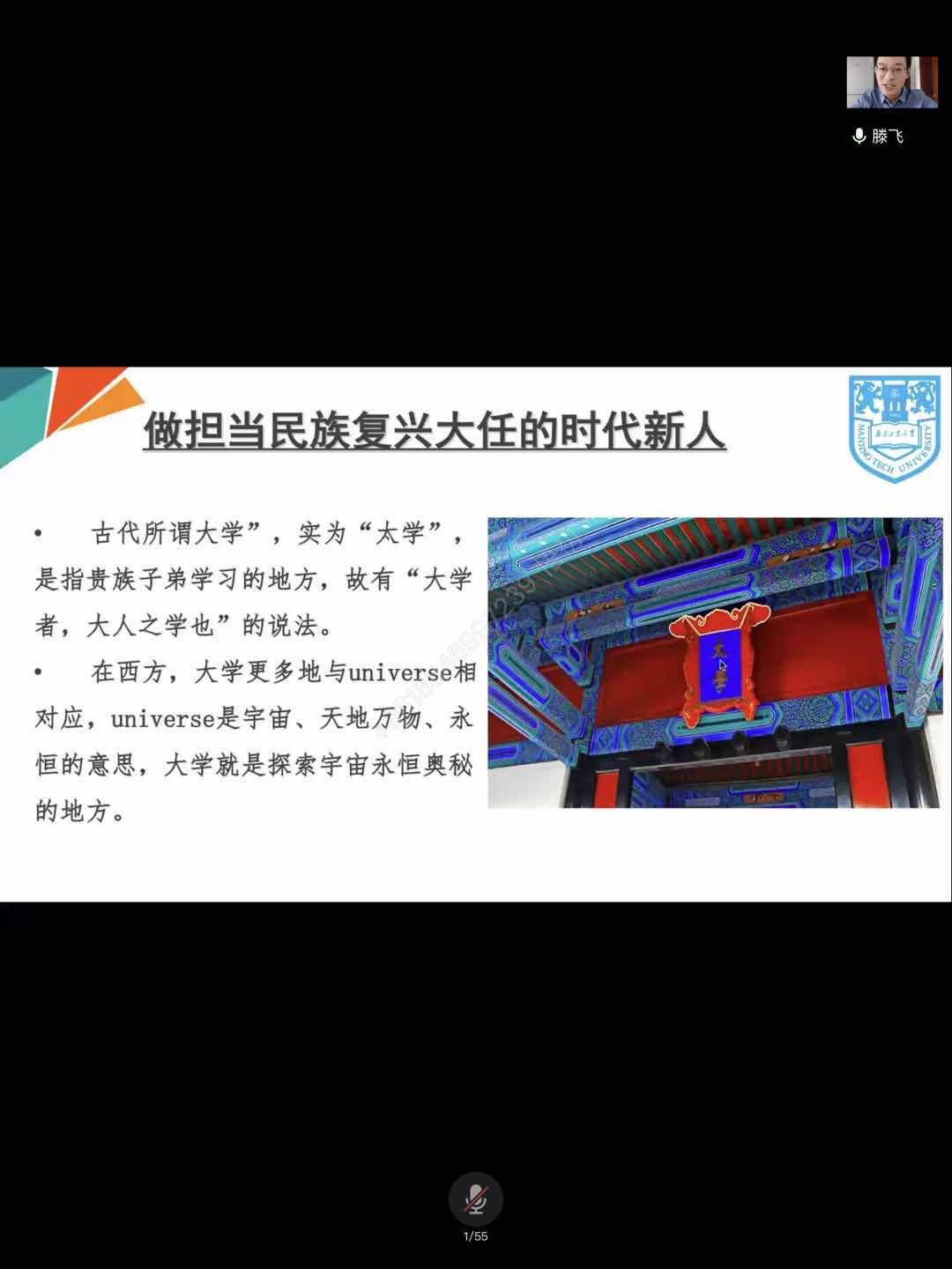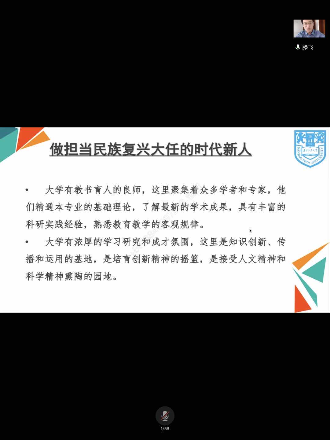 讲座伊始,滕老师向新生们解释了什么是大学、大学培养的是怎样的人、来到大学的目的,并强调在大学里不应当只沉醉于自然科学的学习,也应该加强人文科学的学习,增加自己的文化底蕴和内在修养。随后,滕老师从讲解新时代青年的特色出发,通过对比五四运动时期的新青年和当代新青年,启发同学们对大学做什么样的人、怎样做人、树立怎样的价值观等问题进行深入思考。明确了我们要做担当民族复兴大任的时代新人。最后,滕老师点明理想与信念内涵,解释了理想与空想的差别,强调理想从现实中产生,具有实践性,并以自己的亲身经历为例,让同学们对理想有一个更好的认识。演讲将近结束时,滕老师再一次向新生们介绍了太阳成集团明德、厚学、沉毅、笃行的校训,并从自己的角度阐述了对于校训的理解,希望大家都能做好自己,迎接美好未来。