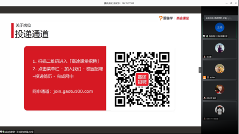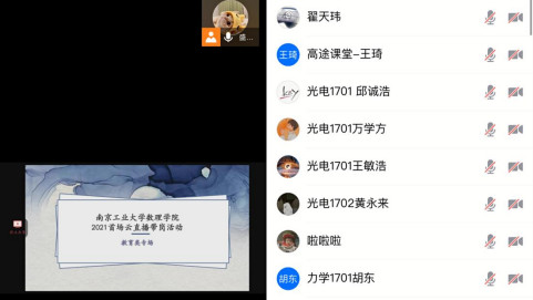 3月15日晚上,公司邀请了南京猿辅导在线教育集团、南京学而思培优、南京学而思爱智康、南京跟谁学教育科技有限公司4家企业开展了一场教育类专场就业讲座“云直播带岗”,公司2021届全体毕业生、18级部分同学参加此次讲座,讲座由毕业班辅导员盛天祺老师主持。