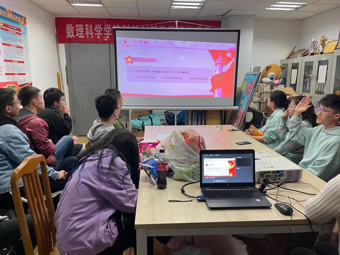 党史知识竞答赛设计了“必答题”,“抢答题”和“观众互动题”环节,奖品设置了签字笔、笔记本和小零食。现场竞答氛围浓烈,大家或三五结伴热烈讨论,或屏息凝神查阅资料,或全神贯注答题思考。此次竞答赛极具参与感、互动性和体验度,能激发同学们对党史的理解和对革命精神的领悟。竞赛结束,所有同学都赢取了丰厚的奖品。