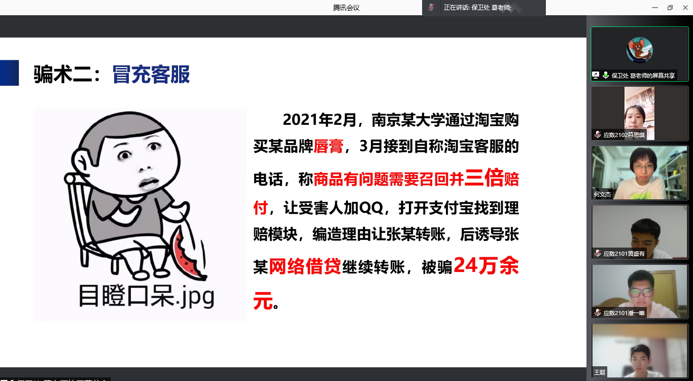 阅读次数: 发布时间:2021-09-25为提升公司2021级新生的安全意识,提升自我保护能力,创建平安校园,9月24日晚7时,太阳集团tcy8722通过腾讯会议开展了面向全体2021级新生的线上校园安全教育讲座。本次讲座邀请校保卫处葛凯老师主讲,2021级新生辅导员杨德旭老师主持。