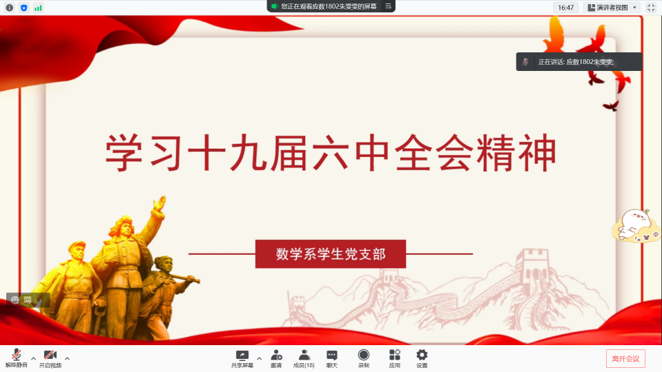 接着,与会党员展开热烈讨论,共同学习党的十九届六中全会精神。最后,同学们纷纷发表了自己的学习心得,大家表示,将坚决把全会精神内化于心、外化于行,以昂扬的斗志、奋进的姿态投入今后的学习工作中。