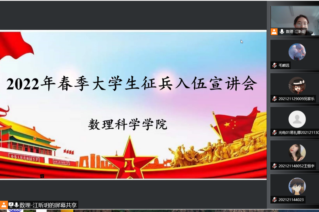 江昕玥老师就2022年春季老员工征兵入伍政策、申报条件、报名流程等问题作了详细的解读,号召同学们把握机遇,让热血军营成为自己施展才华、成就理想的新平台。同时,也向同学们强调了报名前体检流程、征兵过程中需要注意的疫情防控问题以及提醒同学们提前准备政审相关材料。