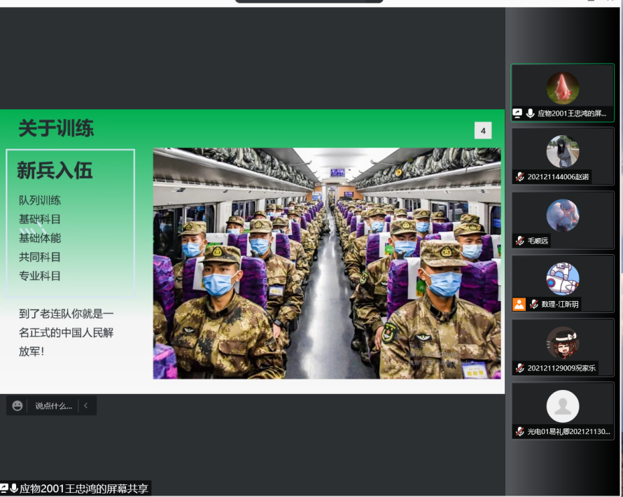 来自2019级本科生马琛琛、2020级本科生王忠鸿和2021级本科生杨聶郗分别就自己的入伍动机、军营生活和参军感悟进行了回顾和分享,谈到了军营生涯带给自己的成长,更磨炼了自己的意志,让自己有勇气和能力去面对人生的挑战和困难,同时结合入伍的经历与收获,鼓励同学们到军营中体验别样青春,最后向同学们发出了投身军营、携笔从戎的号召。