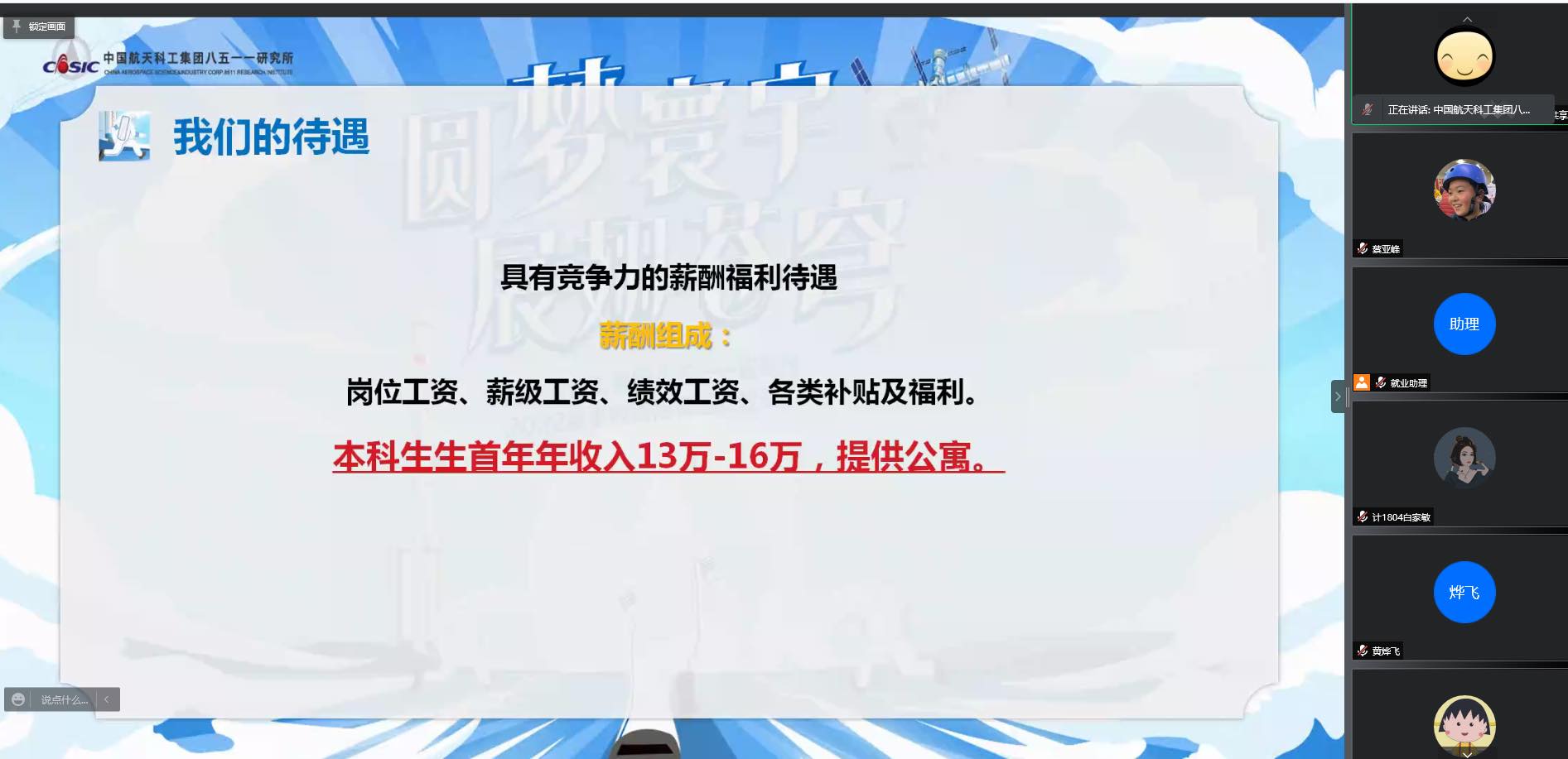 此次线上招聘会共吸引了中国航天科工集团八五一一究所、比亚迪汽车工业有限公司、中磊(苏州)研发中心、中科创达软件股份有限公司、山石网科通信技术有限公司、浩鲸云计算科技股份有限公司等43家合作单位提供了近三百个招聘岗位。会议平台上用人单位不仅进行了线上宣讲,还回答了毕业生关注的问题。公司作为组织方提供了后续简历投递、笔面试组织等追踪服务工作。