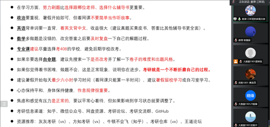 四位主讲人根据自身的考研经历,从数学、英语、政治和专业课四个方面详细地介绍了自己的备考过程,将自己各个阶段的任务规划、时间安排以及备考资料都进行了详细讲述。同时,几位主讲人建议同学们结合自身的基础制定考研计划,不要盲目从众,做好学习规划,调整好自身心态,积极备考;提醒同学们关注网站发布的信息并及时地了解相关公司的基本情况;最后,学长们还强调了心态调整对考研的重要性,建议合理作息,定期锻炼,毕竟“身体是革命的本钱”,祝福学弟学妹们能够成功上岸,考入理想学府。在自由问答环节,同学们踊跃发言、积极提问,学长们耐心细致地为同学们答疑解惑。