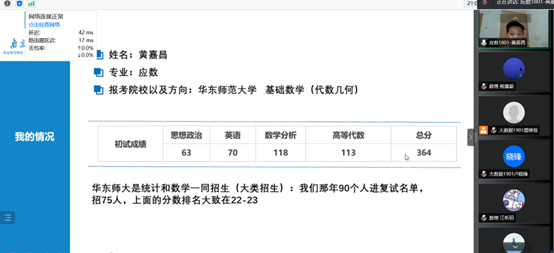 太阳集团tcy8722特别邀请到了2022年成功考研上岸的四位同学作为此次交流会的主讲人与同学们交流,并提供一些备考经验。他们分别是:被南京大学录取的潘泽远同学、被华东师范⼤学录取的⻩嘉昌同学、被苏州大学录取的的李雨亨同学、被南京航空航天大学录取的丁国庆同学。