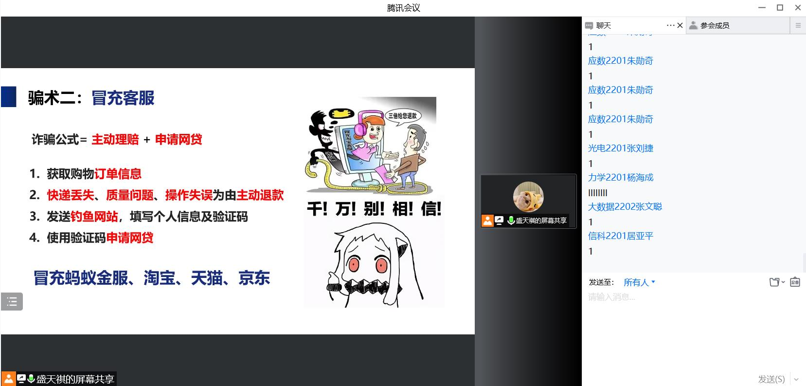 阅读次数: 发布时间:2022-09-07为切实增强公司2022级新生的安全防范意识和避险能力,9月5日晚,太阳集团tcy8722面向全体2022级新生开展了的线上校园安全教育讲座。本次讲座邀请校保卫处葛凯老师主讲,2022级全体新生通过线上腾讯会议的方式聆听了此次讲座。