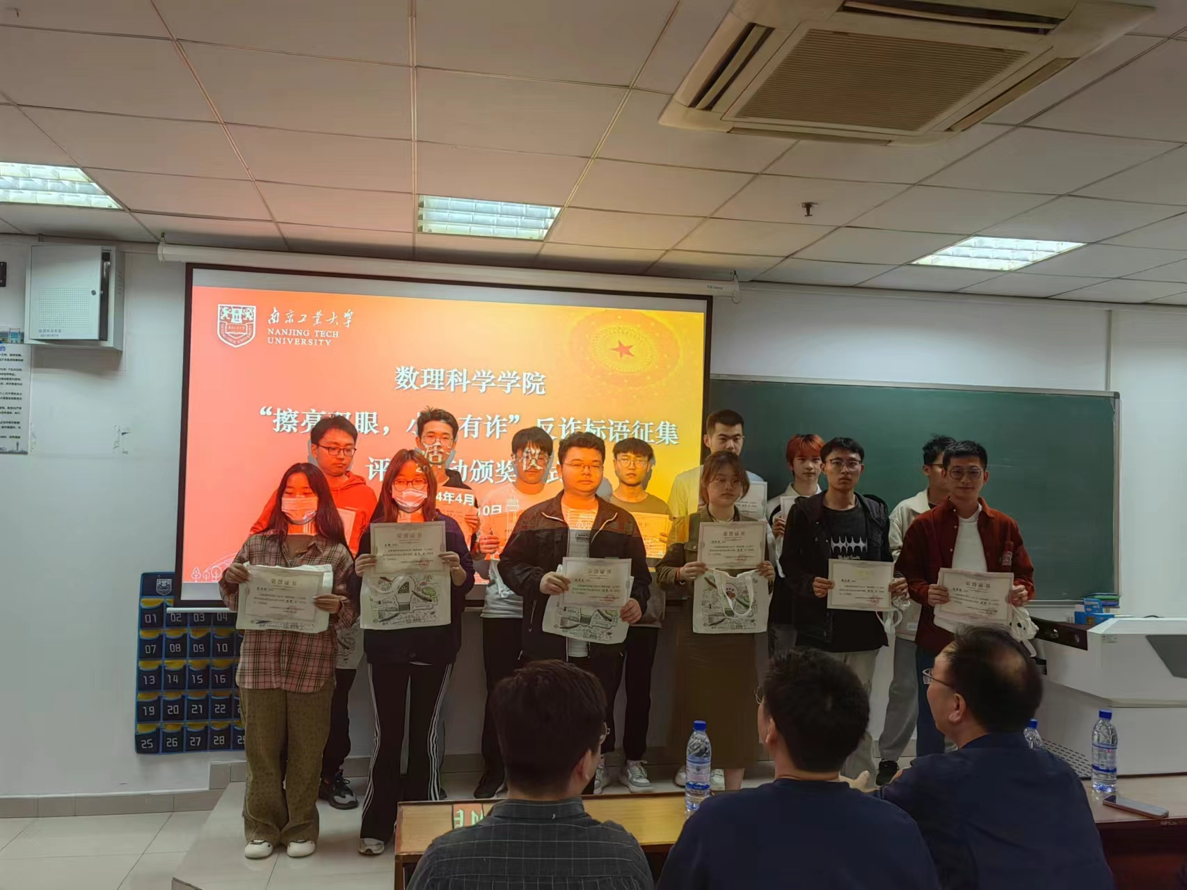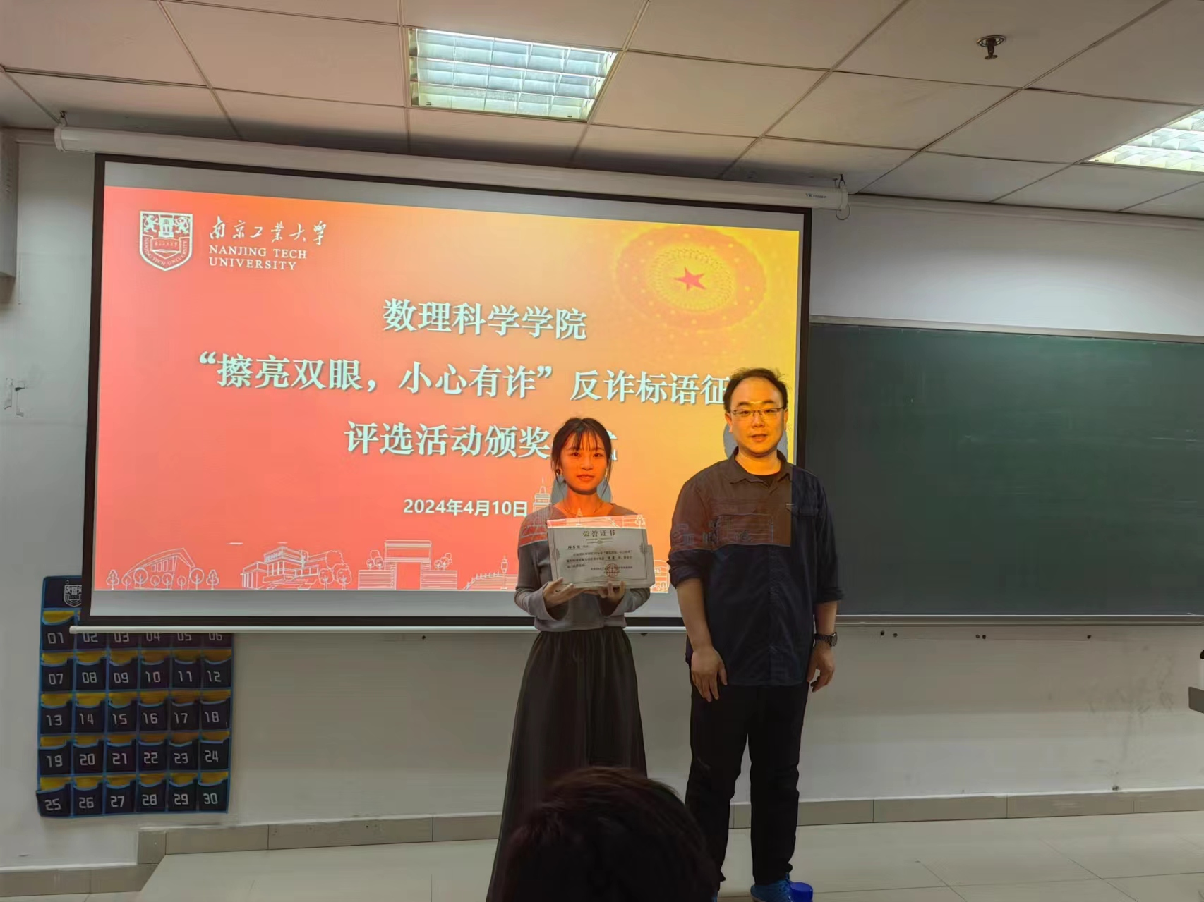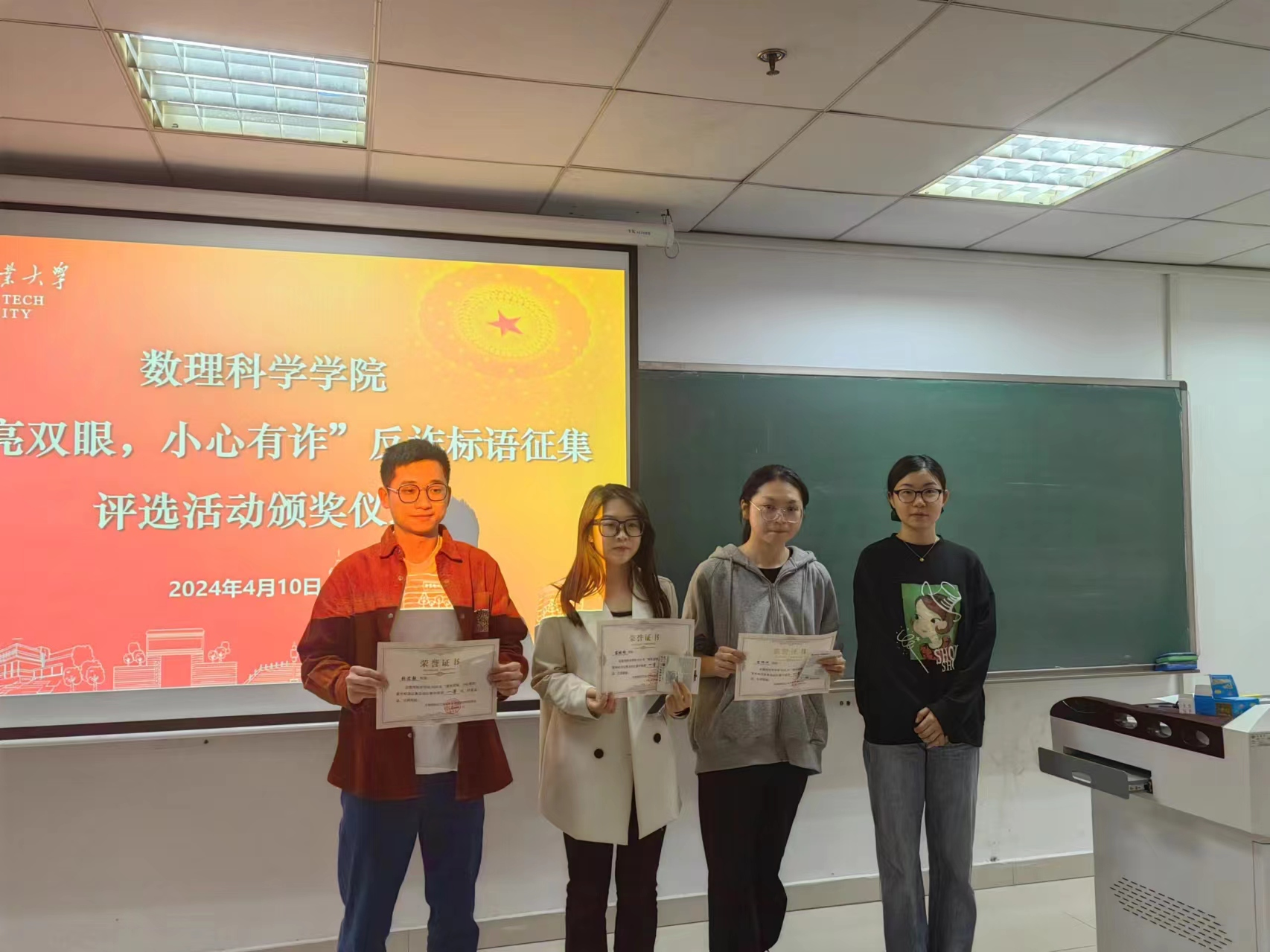 阅读次数: 发布时间:2024-04-124月10日下午4:00,太阳集团tcy8722在笃学C201教室举办“反电诈宣传月”总结大会暨“擦亮双眼,小心有诈”反诈标语征集活动颁奖仪式,公司党委副书记蔡亚峰、学办全体辅导员以及获奖同学参加仪式。