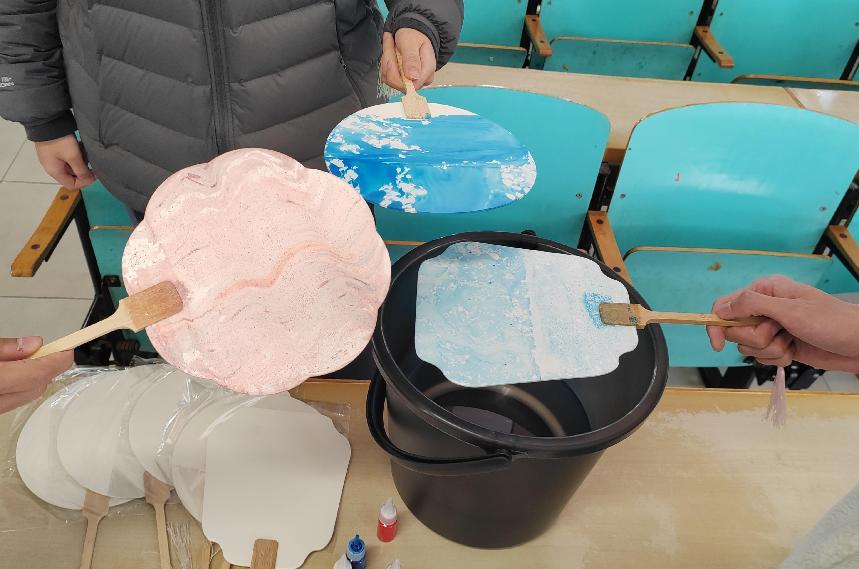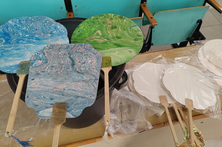 漂漆团扇,以漆作画,以扇为纸,绝美东方色彩。在活动现场,经过工作人员和组织者的详细讲解,同学们在深入地领略到了非遗漆扇的魅力后也迫不及待地自己动手。选择自己喜爱的颜色,漆扇形状,将颜料滴入水中,扇子缓缓放入晃动提转,水波荡漾间,扇面呈斑斓图案,似星辰,似飞天,似江海山川……同学们的心绪、烦恼也好像随着涟漪荡漾至远处,在有限的闲暇中放空了思想,追逐着内心的自我。漆扇之上,细腻纹路勾勒别样美感,无论是红蓝鎏金,还是清粉淡烟,是同学们心理的美好象征,也是对于美的不同见解;漆扇在手,如握流光,轻轻一摇,便摇曳处满室的诗意与遐想,在绝对的东方美学下给予同学们绵延不绝的心灵疗愈和抚慰。同时,同学们在活动中互帮互助,交流着各自的想法与作品,进一步增进了同学的感情,增强集体的向心力与凝聚力,进一步促进了心理健康。