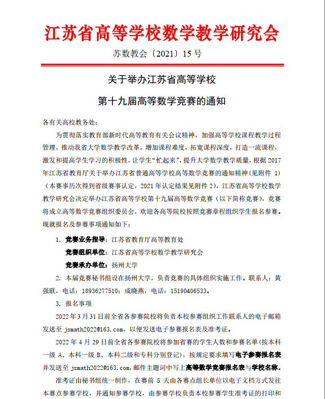 关于举办江苏省高等公司第十九届高等数学竞赛的通知