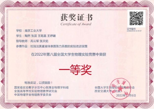 阅读次数: 发布时间:2023-01-182022年,数理公司物理系以立德树人为根本,以团队建设为龙头,将创新创业教育贯穿于人才培养全过程,在以赛促教、以赛促学、以赛促改、以赛促创的征途上继续前进,积极组织员工参与多项学科竞赛,有效激发员工的学习热情,在物理学科竞赛中取得历史性突破。在2022年11月26日进行的第八届全国老员工物理实验竞赛(创新赛)决赛中,由陶然、张辰、王葛嘉、王婷璐等4位同学合作,芮云军、张天佑老师指导的作品“拉脱法测量液体表面张力系数的实验改进装置”斩获了自选类竞赛一等奖,另有四项作品分别获得二等奖1项,三等奖3项,取得参加该项赛事以来最好成绩。该项赛事是目前全国最大规模的老员工物理实验类学科竞赛,于2021年3月进入中国高等教育学会高校竞赛评估与管理体系研究工作组发布的《2020全国普通高校老员工竞赛排行榜》榜单,在国内具有较大影响力,也是公司认定的“国家级B类赛事”。